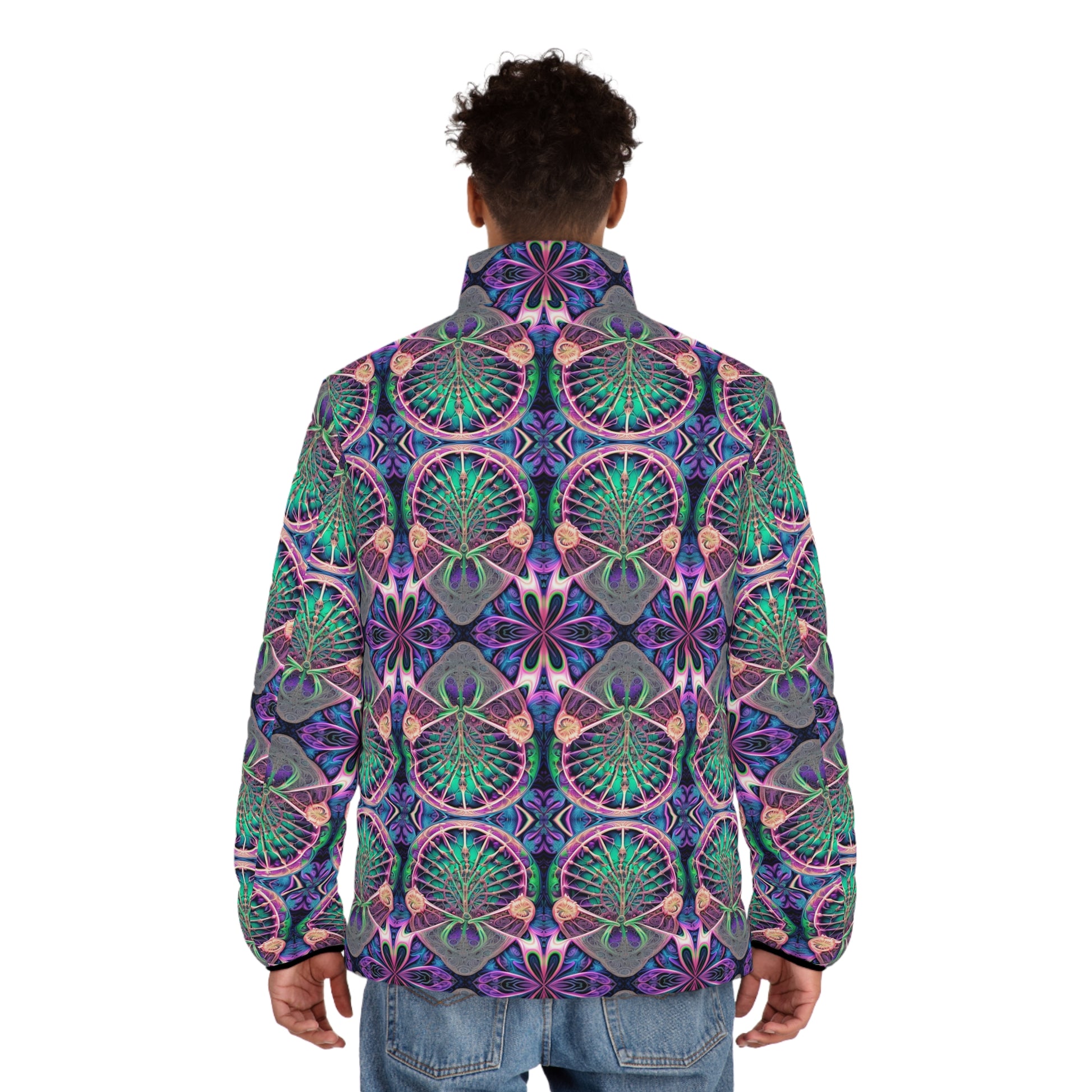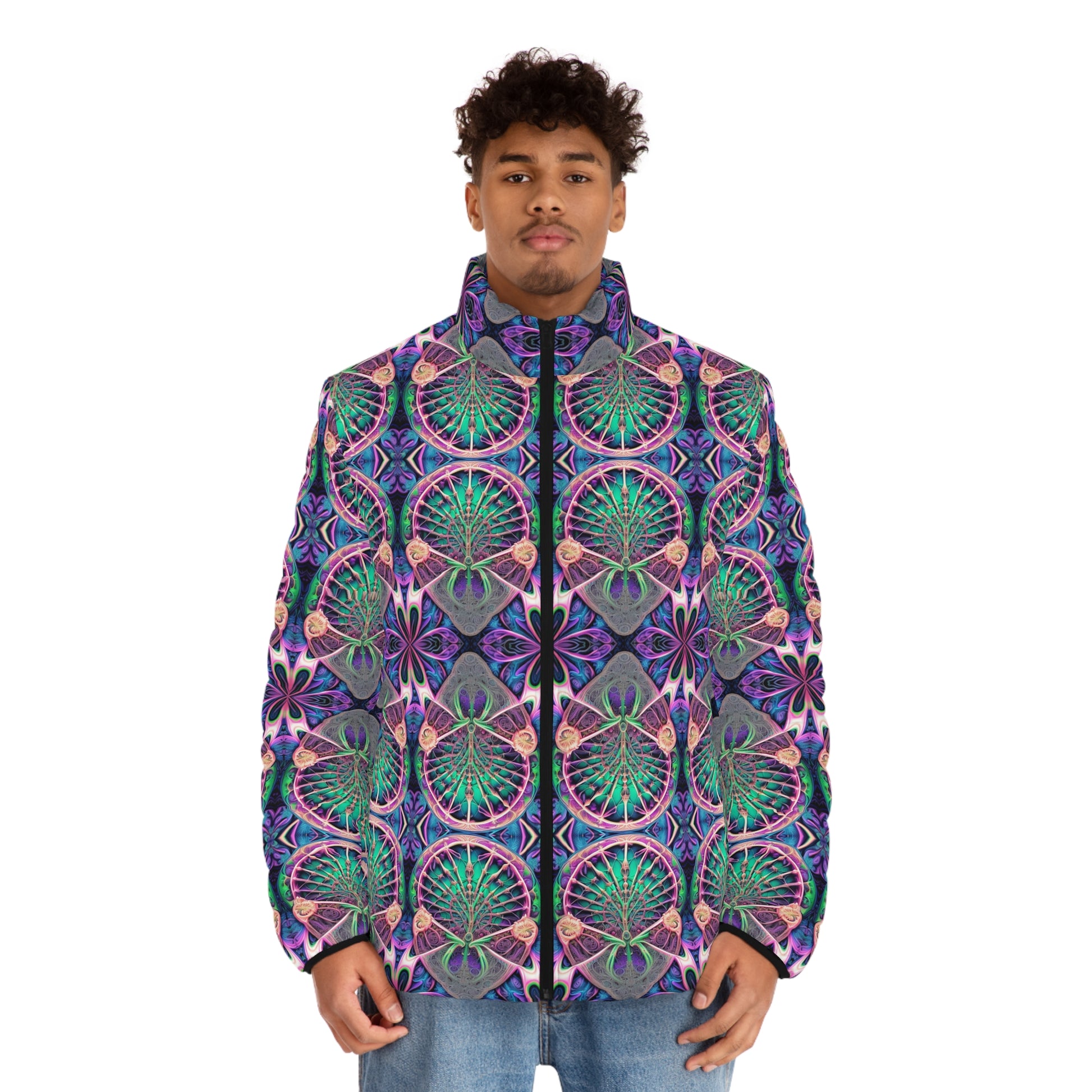 PSYCH 01 Men’s Puffer Jacket – Bold Psychedelic Festival Outerwear