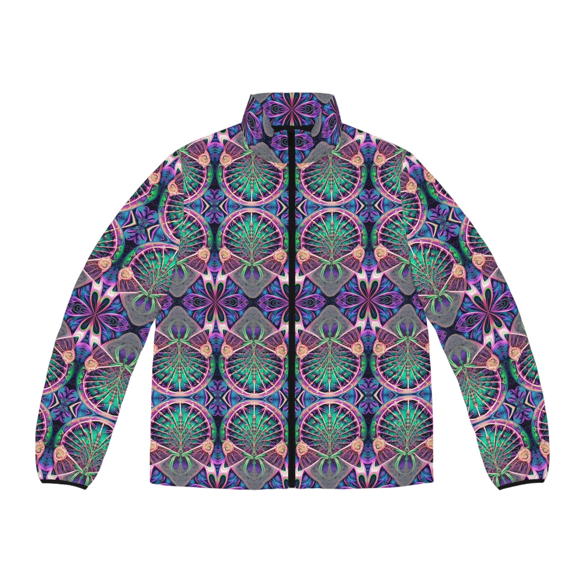 Unleash bold style and unparalleled comfort with the PSYCH 01 Men’s Puffer Jacket, featuring an intricate psychedelic geometric design in vibrant tones of purple, green, and pink. Perfect for festival-goers, streetwear enthusiasts, and lovers of unique fashion, this jacket combines head-turning visuals with all-day comfort, making it the ultimate statement piece for cooler weather.